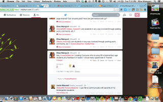 As soon as I got home I posted a couple of tweets asking if anybody was using FB with elementary age children. Although I’ve done this before, this was the first time I included someone who is a well-known educator (@coolcatteacher) rather than simply depending on hashtags. Once she favorited my tweet and retweeted it I started getting replies. Before I knew it, I was involved in an hour-long conversation with several educators.